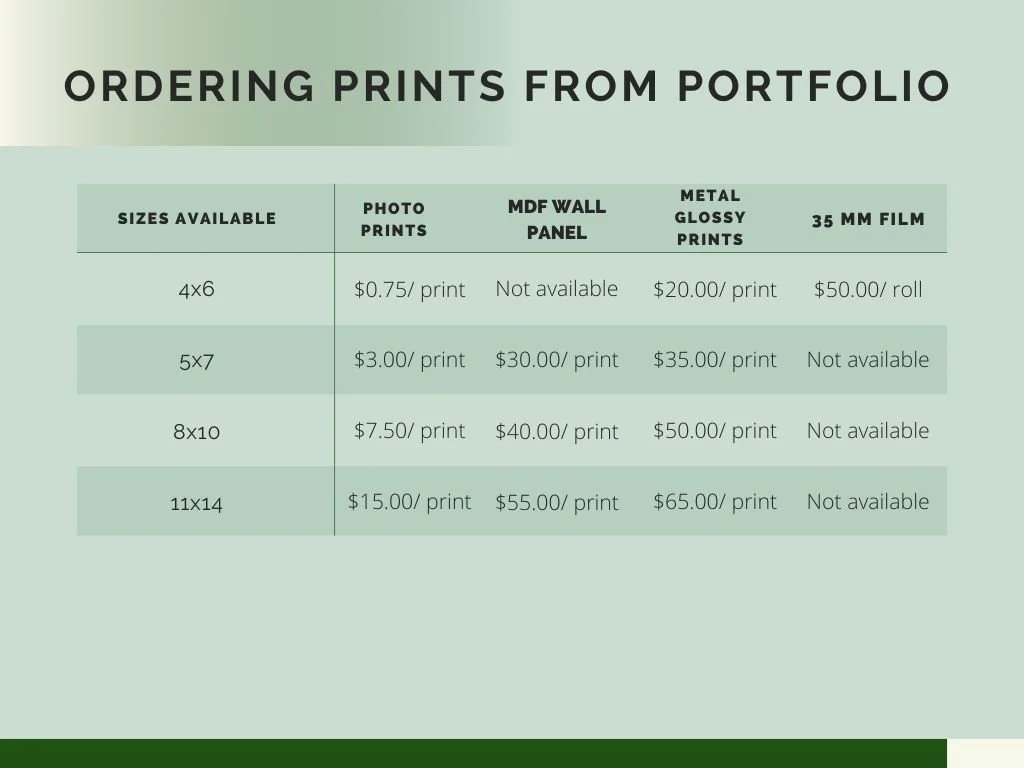 Ordering additional prints are available for all services. The prices above apply to the orders for prints from the Portfolio page and can be used as add on’s if you had a photoshoot session. If you are ordering additional prints from your session, any photo print will be charged after the 10 4x6 photo prints that are included in the session price.